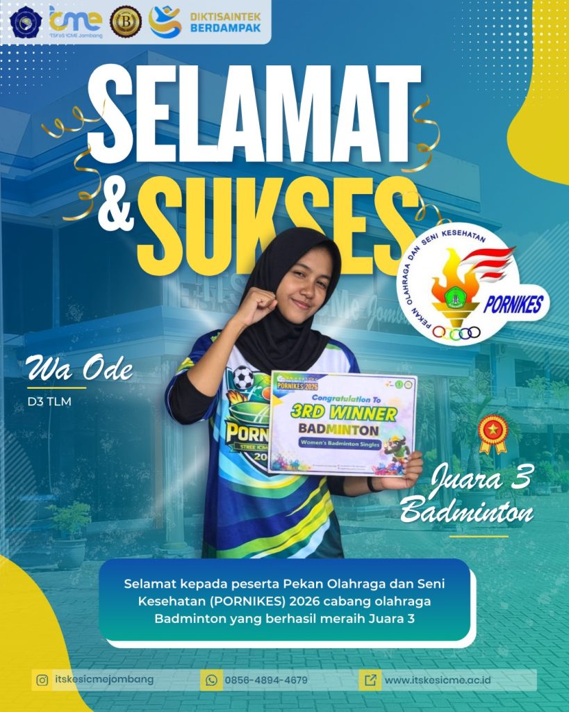 Jombang – ITSKes ICMe Jombang kembali menorehkan prestasi membanggakan di bidang olahraga. Pada ajang Pekan Olahraga dan Seni Kesehatan (PORNIKES) 2026 cabang olahraga badminton, ITSKes ICMe Jombang berhasil meraih Juara 3.
