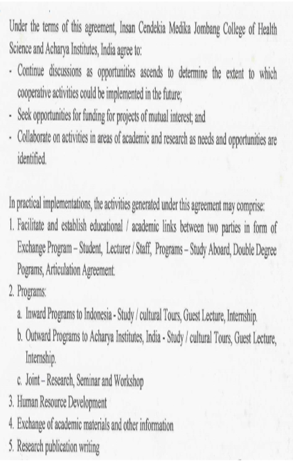 PERJANJIAN KERJA SAMA ANTARA INSTITUT TEKNOLOGI SAINS DAN KESEHATAN INSAN CENDEKIA MEDIKA JOMBANG DENGAN ACHARYA INSTITUTES, BENGALURU, INDIA